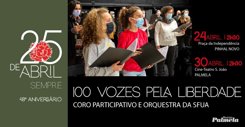 No âmbito das comemorações do 48.º aniversário do 25 de Abril, não perca o concerto “100 Vozes pela Liberdade”, a 24 de abril, às 21h30, na Praça da Independência, em Pinhal Novo, e a 30 de abril, à mesma hora, no Cine-Teatro S. João, em Palmela.