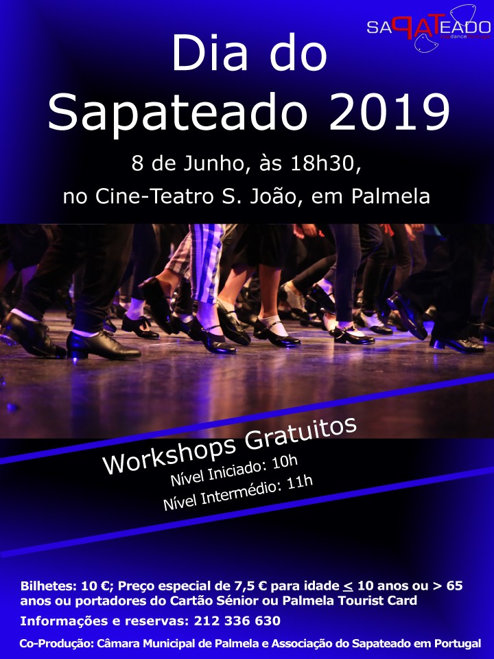 Comemore o Dia Mundial do Sapateado em Palmela! Venha participar na Festa do Sapateado, a partir das 18h30, mas não perca o Workshop de Sapateado para iniciados, às 10h00, e nível intermédio às 11h00.