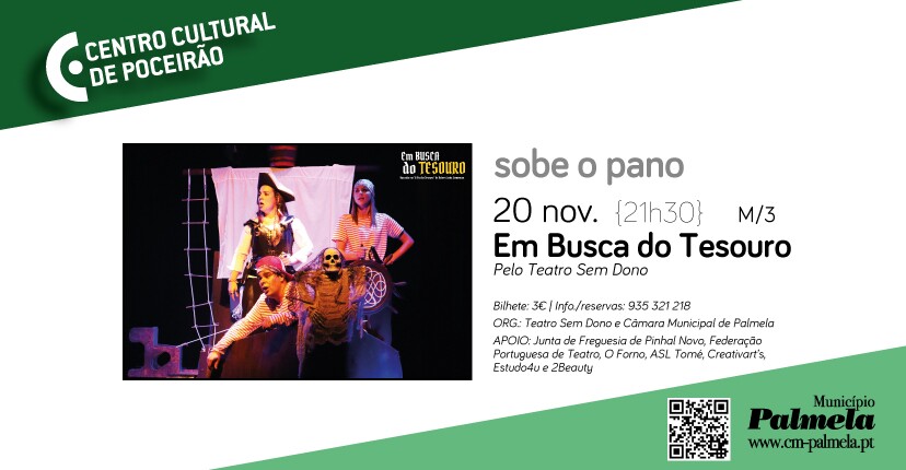Depois da estreia em Pinhal Novo, em outubro, a nova peça do Teatro Sem Dono, “Em Busca do Tesouro”, passa agora pelo Centro Cultural de Poceirão, com uma sessão no dia 20 de novembro, às 21h30.