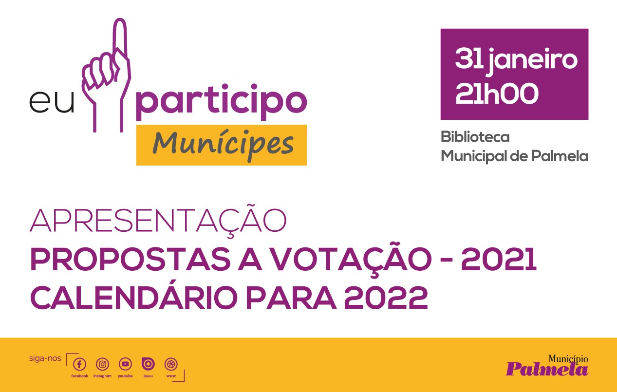 O Município de Palmela realiza uma sessão pública presencial do “Eu Participo Munícipes” no dia 31 de janeiro, às 21h00, na Biblioteca Municipal de Palmela.