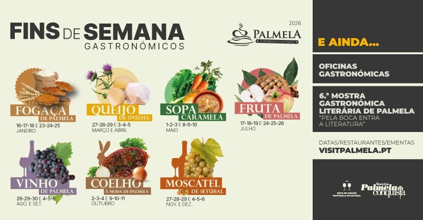 O calendário PES 2026 arrancou com os Fins de Semana Gastronómicos da Fogaça de Palmela e vai apresentar diversas propostas nos próximos meses. Destaque para os próximos Fins de Semana Gastronómicos temáticos, durante os quais os restaurantes participantes vão apresentar ementas com entradas, pratos principais, sobremesas e bebidas elaborados a partir do produto regional em destaque. As Oficinas Gastronómicas e a 6.ª Mostra Gastronómica Literária de Palmela “Pela Boca Entra a Literatura”, que alia gastronomia e cultura de forma criativa, são outras sugestões a não perder.