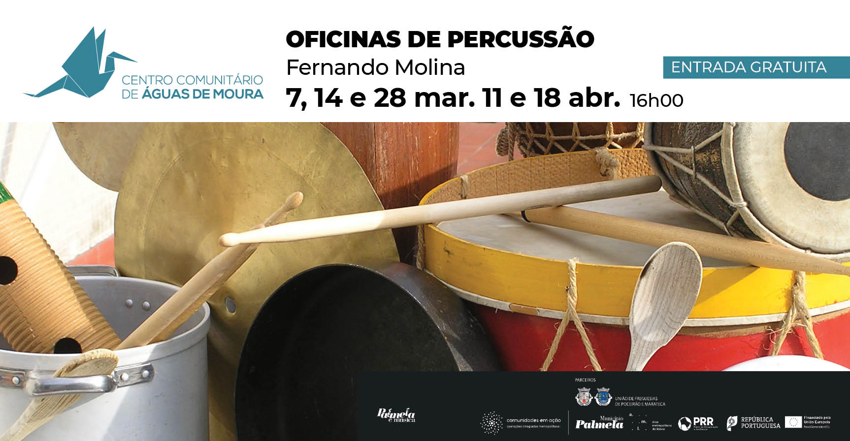 O Centro Comunitário de Águas de Moura (CCAM) recebe, nos dias 7, 14 e 28 de março, e em abril dias 11 e 18, às 16h00, Oficinas de Percussão orientadas pelo formador Fernando Molina.