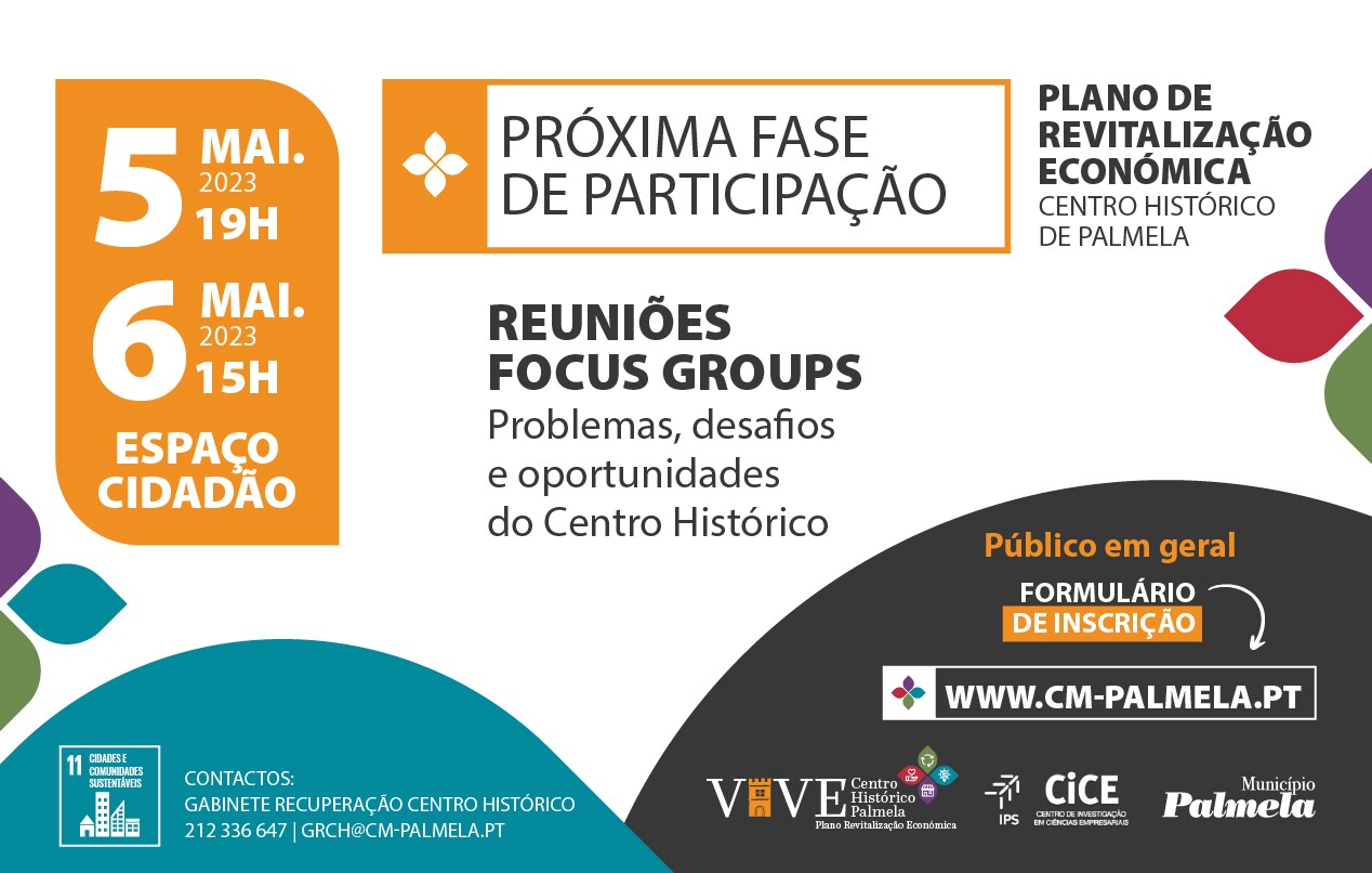 A primeira sessão pública decorreu dia 19 de abril, no Espaço Cidadão, em Palmela. A próxima fase do projeto - as reuniões dos Focus Groups, entrevistas em grupo para que cada participante fale sobre os problemas, desafios e oportunidades, está agendada para os dias 5 de maio, às 19h00, e 6 de maio, às 15h00, no Espaço Cidadão.
