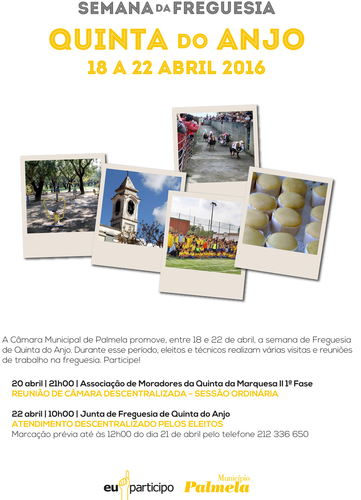 A Câmara Municipal de Palmela promove, entre 18 e 22 de abril, a semana de Freguesia de Quinta do Anjo. Durante esse período, eleitos e técnicos realizam várias visitas e reuniões de trabalho na freguesia. Participe!