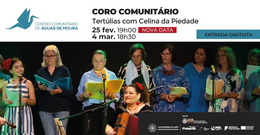 O Centro Comunitário de Águas de Moura recebe, nos dias 18 de fevereiro - sessão cancelada - e 4 de março, às 18h30, duas sessões do Coro Comunitário, uma iniciativa que propõe tertúlias em torno do cancioneiro tradicional, orientadas pela reconhecida música e investigadora Celina da Piedade.