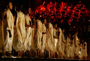 A Palmeloa – «figura mater de Palmela, Deusa-Mãe, altiva, forte e geradora de paixões carnais, de cujo ventre brotam os elementos Água, Ar, Terra e Fogo» - é a personagem principal do espectáculo. Juntam-se-lhe o Senhor de Branco, que conduz os povos na busca de felicidade; os Mordomos da Festa, filhos da Palmeloa, que garantem que o julgamento se realiza todos os anos; os Vassoureiros, filhos dos Mordomos, que guardam o jazigo; os diabretes, representação sarcástica dos povos oprimidos, que aguardam o julgamento anual nesta noite mágica. Misticismo e ritual conjugam-se com uma reflexão sentida sobre o estado do mundo, em jeito de balanço anual.