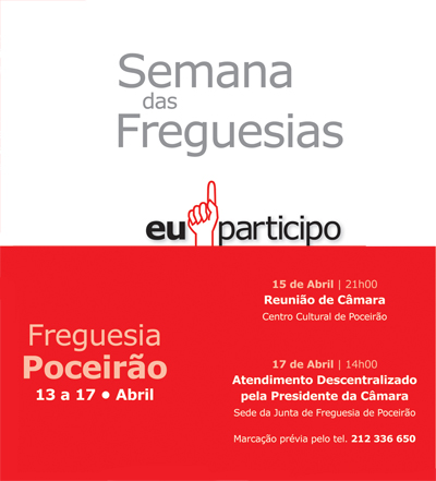 Do programa público fazem parte a reunião do Executivo, no dia 15, quarta-feira, às 21 horas, no Centro Cultural de Poceirão, e o atendimento descentralizado pela Presidente da Câmara, no dia 17, sexta-feira, a partir das 14 horas, na sede da Junta de Freguesia.