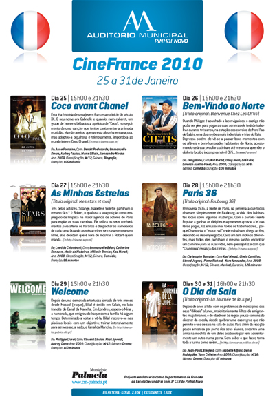 O projecto, nascido em 2003, procura difundir o cinema francês, e consequentemente, a língua e cultura francesas, junto do público escolar e da comunidade, e conta, este ano, com a apresentação de seis longas-metragens, entre os dias 25 e 31 de Janeiro: “Coco Avant Chanel” de Anne Fontaine, a comédia de culto “Bem-Vindo ao Norte” de Dany Boon, “As Minhas Estrelas” de Laetitia Colombani, “Paris 36” de Christophe Barratier, “Welcome” de Philippe Lioret e “O Dia da Saia” de Jean-Paul Lilienfeld.