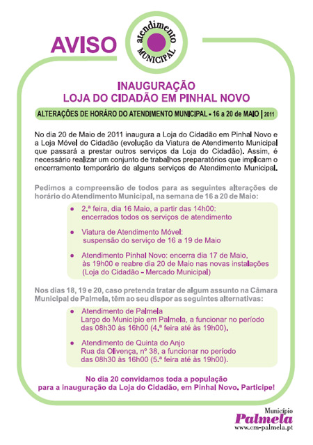 - Atendimento de Pinhal Novo | encerra no dia 17, às 19h00, e reabre no dia 20, nas novas instalações (Loja do Cidadão – Mercado Municipal).