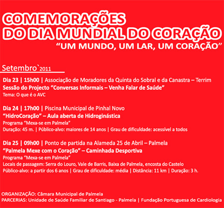 “Palmela Mexe com o Coração” – Caminhada Desportiva do Programa Municipal “Mexa-se em Palmela”, com ponto de partida na Alameda 25 de Abril. Locais de passagem: Serra do Louro, Vale de Barris, Baixa de Palmela e encosta do Castelo. É destinada à população em geral, a partir dos 6 anos. O grau de dificuldade (I a V) é de III - percurso com grau de dificuldade média, para uma distância de 11 km e duração prevista de 3 horas. Inscrição prévia até às 16 horas do dia 23 através do telefone 212336636 ou do e-mail desporto@cm-palmela.pt