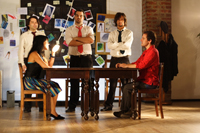 | 16 Julho | 22h00 O português vernáculo, escolhido a dedo entre o rico léxico da nossa língua, é aqui irónico, reactivo, mordaz, insinuante, provocador, e materializa--se em temas como “Nossa Senhora do SIS”, “Diabetes com Chantilly”, “O vestido a Esvoaçar” ou “Estado Febril”. Pop-marialva, fanfarra com tiques à Emir Kusturica, para uma noite divertida ao luar. Baixo: Rui Costa (Silence 4, Filarmónica Gil); Voz e guitarra: Carlos Martins (Umpletrue, The Clits, Annette Blade); Piano e Euphonium: Pedro Santos (Silence 4, Filarmónica Gil); Bateria: José Carlos (Dapunksportif, Umpletrue); Voz: Ana Santo. | |