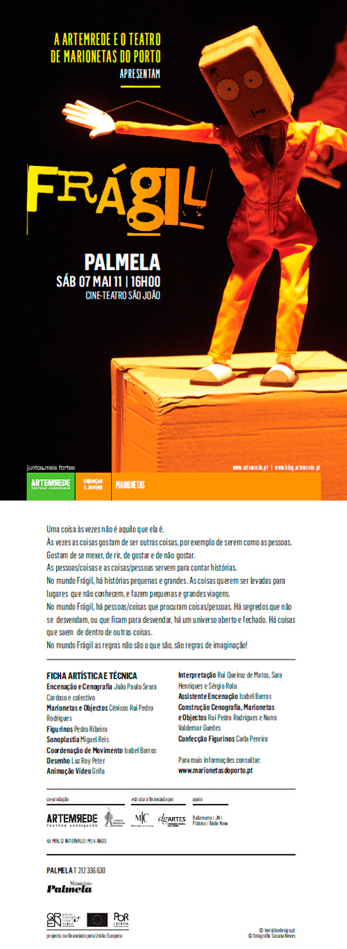 A Câmara Municipal de Palmela e a Artemrede - Teatros Associados promovem, no dia 7 de Maio, às 16 horas, no Cine-Teatro S. João, em Palmela, o espectáculo “Frágil”, pelo Teatro de Marionetas do Porto.