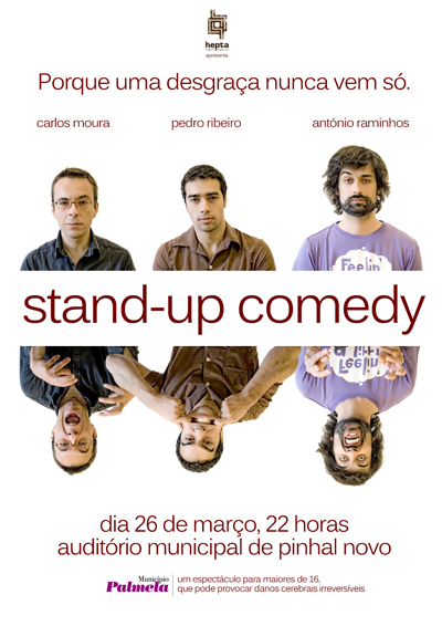 Visto por mais de cinco mil pessoas, o espectáculo - que já passou por várias localidades do país e por Londres - chega agora ao concelho de Palmela para duas horas de pura stand-up comedy, com três visões muito particulares do mundo - o humor prático de Pedro Ribeiro, as observações de Carlos Moura e o nonsense de António Raminhos – uma mistura explosiva.
