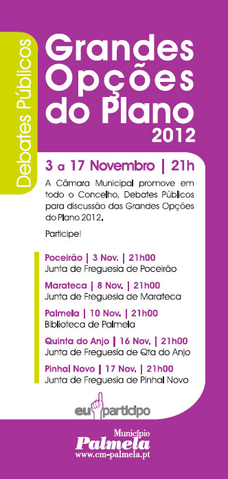 Esta noite, às 21h, na Junta de Feguesia de Pinhal Novo, a Câmara Municipal de Palmela promove o último debate público, no âmbito da preparação do Orçamento e Grandes Opções do Plano 2012.