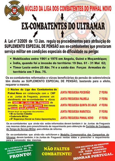 O Núcleo da Liga dos Combatentes de Pinhal Novo, em colaboração com a Câmara Municipal de Palmela e as Juntas de Freguesia do concelho, promove, nos meses de Junho, Julho, Agosto e Setembro, o atendimento aos ex-combatentes e às viúvas para o apoio nos procedimentos relativos à atribuição do Suplemento Especial de Pensão.