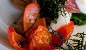 Sopa de batata doce da Comporta, mariscada com rebentos frescos e embrulho de queijo Brie em fillo