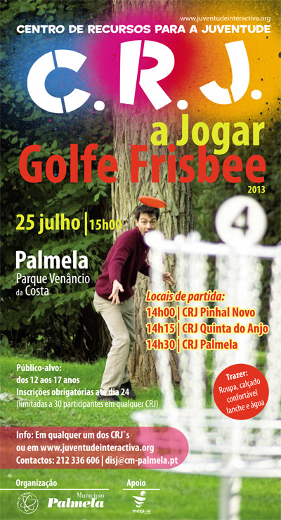 A partir das 15h00, o Parque Venâncio da Costa será palco da iniciativa "CRJ a jogar Golfe Frisbee", numa organização conjunta da Câmara Municipal de Palmela e do Clube de Praticantes de Frisbee – Vira ‘o’Disco.