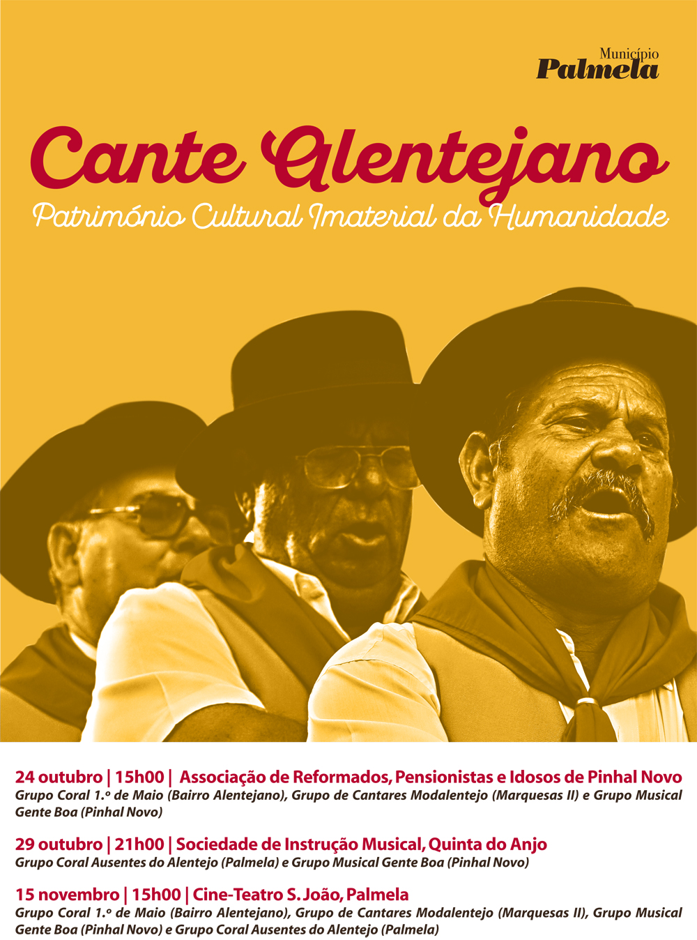 A Câmara Municipal de Palmela promove, nos dias 24 e 29 de outubro e 15 de novembro, três espetáculos de homenagem ao Cante Alentejano, em Pinhal Novo, Quinta do Anjo e Palmela, com entrada gratuita.