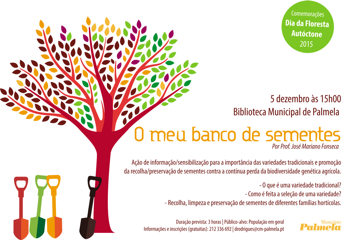 Encontram-se abertas as inscrições para a iniciativa “O meu banco de sementes”, que decorrerá na Biblioteca Municipal de Palmela, no dia 5 de dezembro, às 15h00, no âmbito das comemorações do Dia da Floresta Autóctone. Desenvolvida pelo Prof. José Mariano Fonseca, esta ação pretende informar e sensibilizar para a importância das variedades tradicionais e promoção da recolha e preservação de sementes contra a contínua perda da biodiversidade genética agrícola.