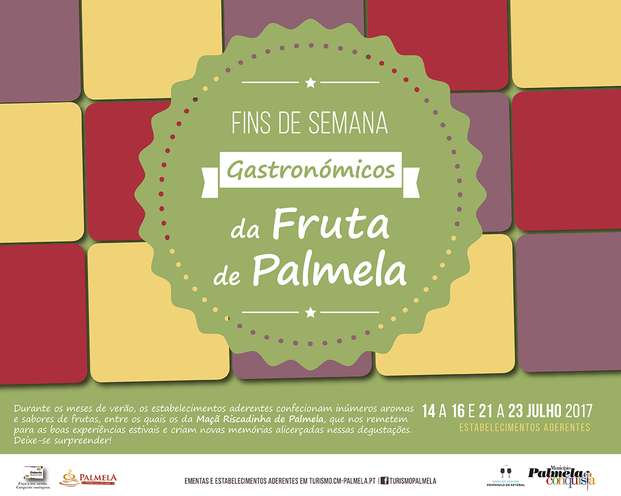 Para valorizar e promover a excelente fruta de Palmela, o Município e a Rota de Vinhos da Península de Setúbal promovem, nos dias 14, 15, 16, 21, 22 e 23 de julho, mais uma edição dos Fins de Semana Gastronómicos da Fruta de Palmela.