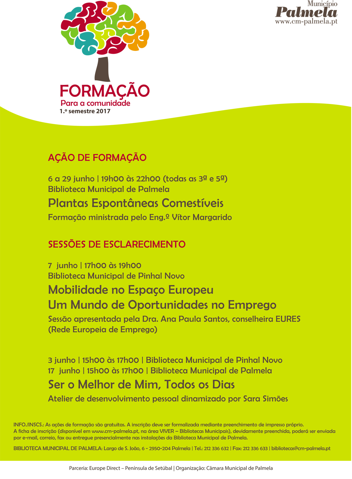 A Câmara Municipal de Palmela promove, em junho, em Palmela e Pinhal Novo, ações de formação para a comunidade, com frequência gratuita. Nos dias 3 e 17, das 15h00 às 17h00, as Bibliotecas Municipais de Pinhal Novo e Palmela, respetivamente, acolhem o ateliê de desenvolvimento pessoal “Ser o Melhor de Mim, Todos os Dias”, por Sara Simões. Entre os dias 6 e 29, (3.ªs e 5.ªs feiras, das 19h00 às 22h00), a Biblioteca Municipal de Palmela recebe a ação de formação “Plantas Espontâneas Comestíveis”, ministrada por Vitor Margarido.