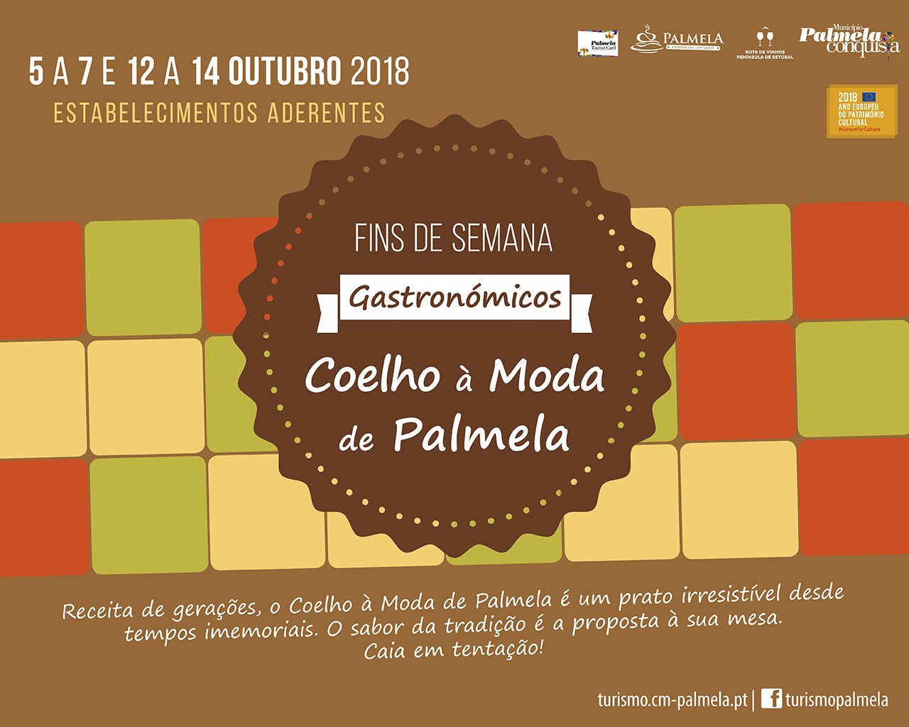 Os Fins de Semana Gastronómicos do Coelho à Moda de Palmela são promovidos pela Câmara Municipal de Palmela, em parceria com a Associação da Rota de Vinhos da Península de Setúbal, e integram o programa de promoção turística “Palmela, Experiências com Sabor!”. A edição de 2018 está quase a chegar ao fim mas, até ao final do ano, ainda vai proporcionar dois fins de semana dedicados ao Moscatel e um Concurso de Doçaria, em novembro, e os Fins de Semana Gastronómicos Natalícios, em dezembro, que se estreiam este ano.