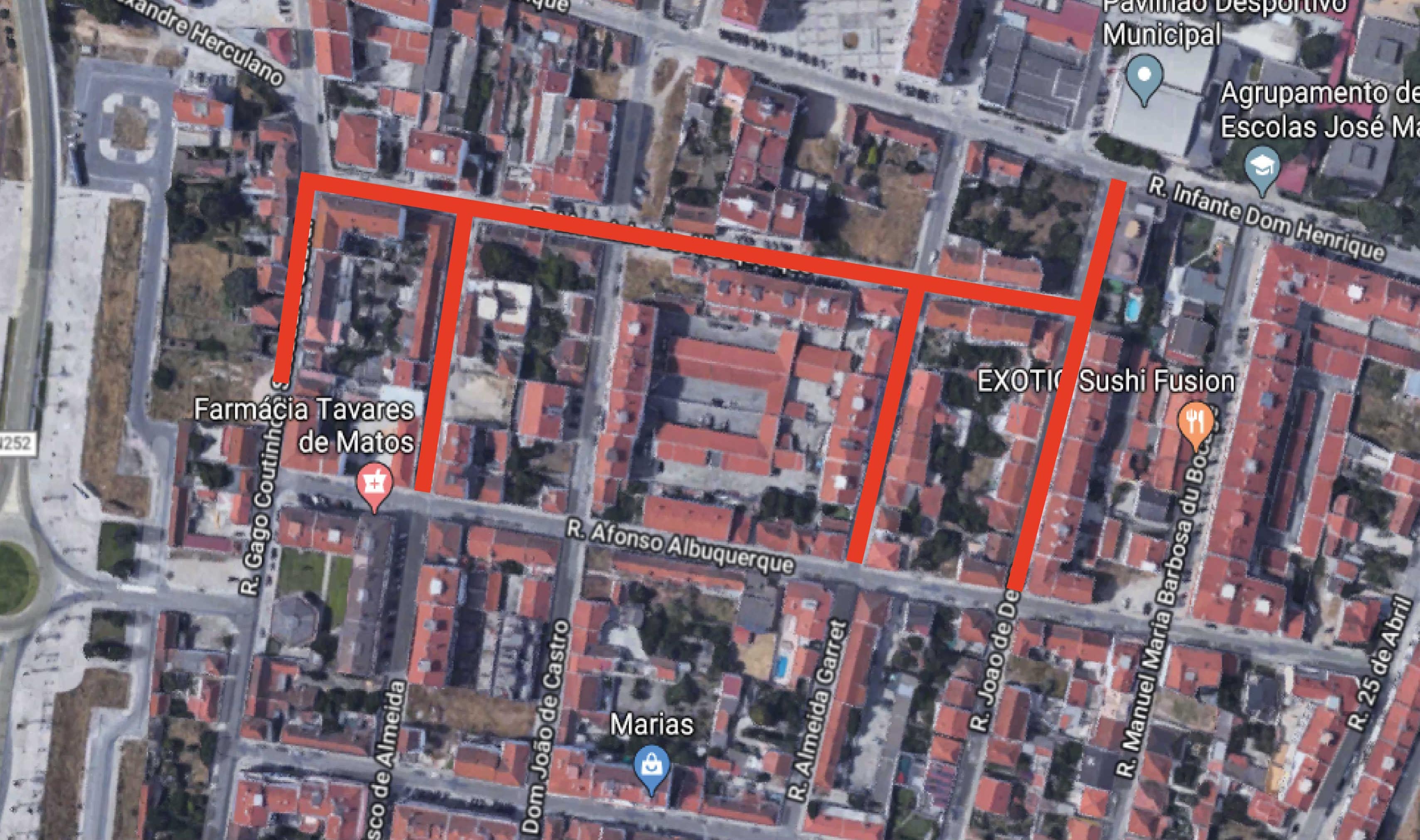 Os trabalhos surgem na sequência da conclusão desta fase de remodelação da rede de abastecimento de água, nomeadamente ao nível dos nós de ligação, e abrangem os seguintes arruamentos: Rua Mouzinho de Albuquerque, em toda a sua extensão e as Ruas Francisco de Almeida, Almeida Garrett e Ruas Gago Coutinho e Sacadura Cabral, nos troços compreendidos entre as Ruas Afonso de Albuquerque e Mouzinho de Albuquerque e a Rua João de Deus, no troço compreendido entre a Rua Afonso de Albuquerque e a Rua Infante D. Henrique.