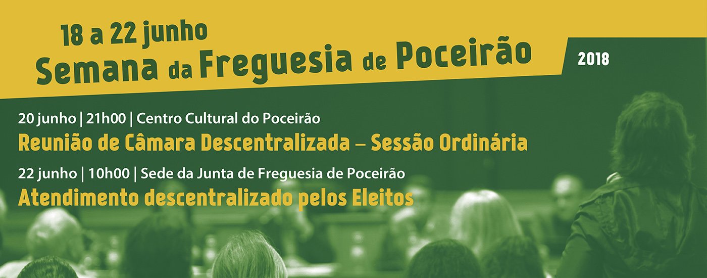A reunião pública quinzenal decorre no dia 20, quarta-feira, às 21 horas, no Centro Cultural de Poceirão, com o período destinado à participação do público a abrir a sessão. O Executivo Municipal com pelouros atribuídos realiza atendimento descentralizado, durante a manhã de dia 22, sexta-feira, na sede da Junta de Freguesia, mediante marcação prévia até às 12 horas de dia 21, através do telefone 212 336 650.