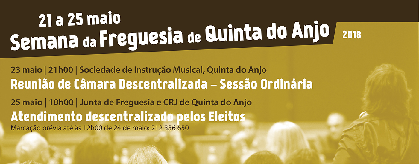 A reunião pública quinzenal realiza-se no dia 23, quarta-feira, às 21 horas, na sede da Sociedade de Instrução Musical de Quinta do Anjo, com o período destinado à participação do público a abrir a sessão. O Executivo Municipal com pelouros atribuídos realiza atendimento descentralizado, durante a manhã de dia 25, sexta-feira, nas instalações da Junta de Freguesia e no Centro de Recursos para a Juventude de Quinta do Anjo, mediante marcação prévia até às 12 horas de dia 24, através do telefone 212 336 650.