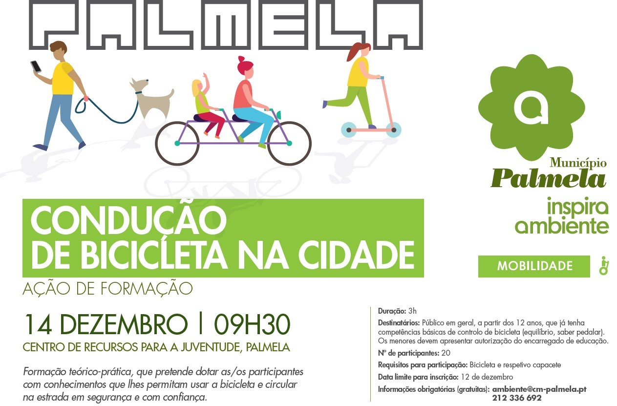Pode participar qualquer pessoa, com mais de 12 anos, que já tenha competências básicas de controlo da bicicleta, como equilíbrio e saber pedalar (as/os menores devem apresentar autorização da/o encarregada/o de educação). As inscrições são gratuitas e devem ser efetuadas até 12 de dezembro, através dos contactos ambiente@cm-palmela.pt ou 212 336 692 (limite de 20 participantes). No dia da formação, é necessário levar bicicleta e capacete.