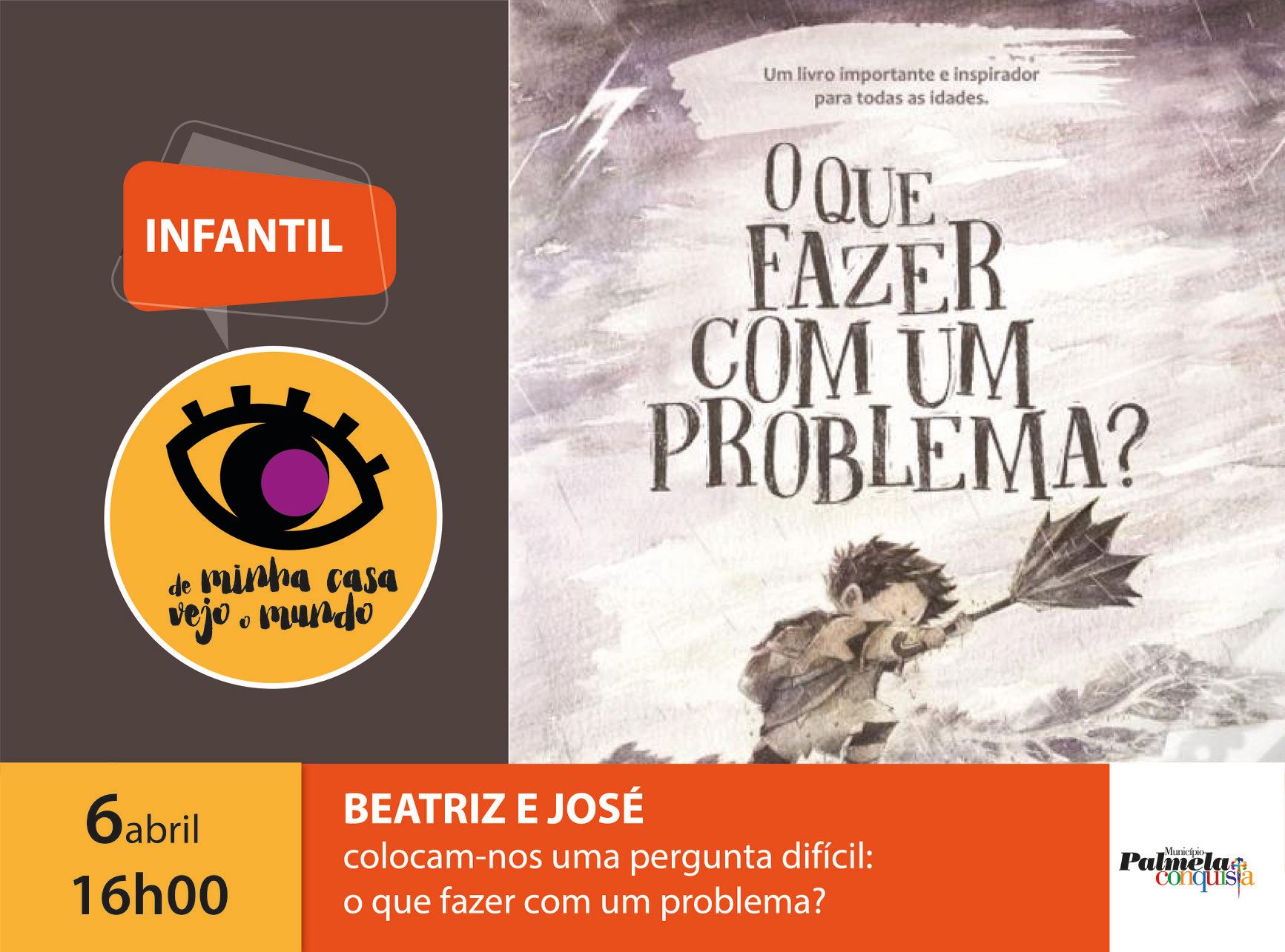 Esta tarde (16h00), Andreia, Beatriz e José Santos contam a história “What do you do with a problem?” (O que é tu fazes com um problema?), de Kobi Yamada, com ilustrações de Mae Besom. Não perca o primeiro vídeo infantil desta semana do projeto municipal “De minha casa vejo o mundo”!