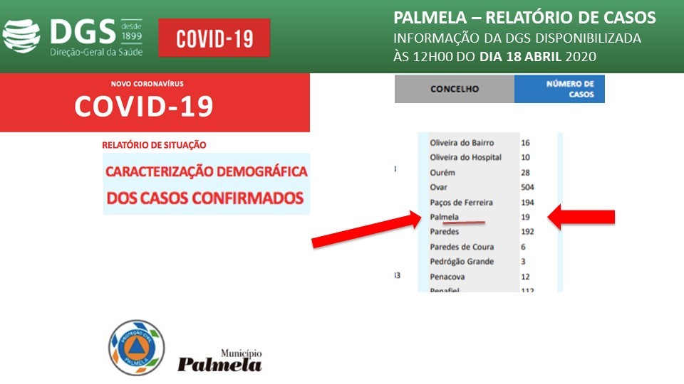 De acordo com informação disponibilizada hoje, dia 18 de abril, às 12h00, no site da DGS/Direção-Geral da Saúde, o concelho de Palmela regista 19 casos positivos de COVID-19.