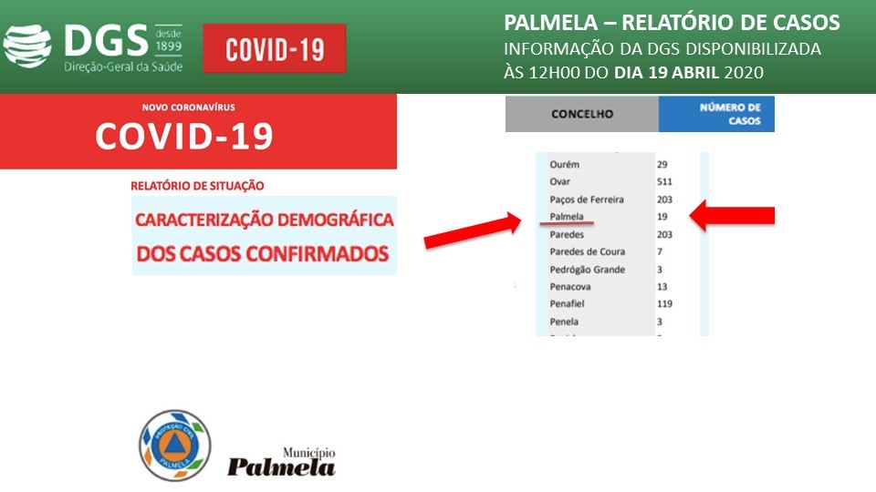 De acordo com informação disponibilizada hoje, dia 19 de abril, às 12h00, no site da DGS/Direção-Geral da Saúde, o concelho de Palmela regista 19 casos positivos de COVID-19.