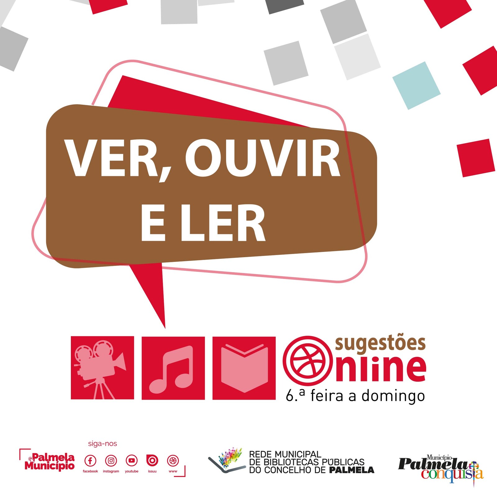Aceda aos canais digitais do Município - Facebook e Instagram Palmela Município - onde pode encontrar as imagens de capa e mais informação sobre as sugestões da Rede Municipal de Bibliotecas Públicas do concelho de Palmela.