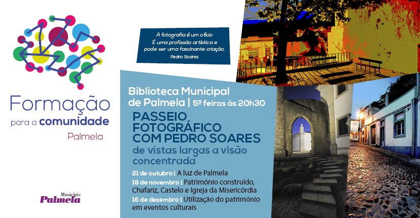 A iniciativa, que integra o Projeto “Formação para a Comunidade”, prevê mais três sessões: 18 de novembro, onde serão comentadas fotografias do Património Construído, como o Chafariz D. Maria I, o Castelo de Palmela e a Igreja da Misericórdia; 16 de dezembro, com a análise de fotos de eventos culturais que decorreram em Património Edificado e, por último, a terceira sessão, em data a divulgar, que consistirá na realização de uma visita fotográfica pelo Centro Histórico de Palmela.