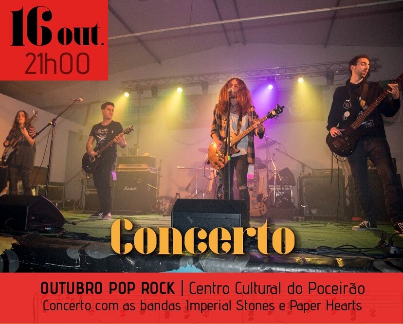 As bandas Imperial Stones e Paper Hearts, participantes na edição de 2020 do Concurso de Bandas Amadoras de Palmela - Warm Up “Março a Partir”, atuam a 16 de outubro, às 21h00, no Centro Cultural de Poceirão, no espetáculo “Outubro Pop Rock”. Com entrada gratuita, o concerto integra a programação “Outubro - Mês da Música”.