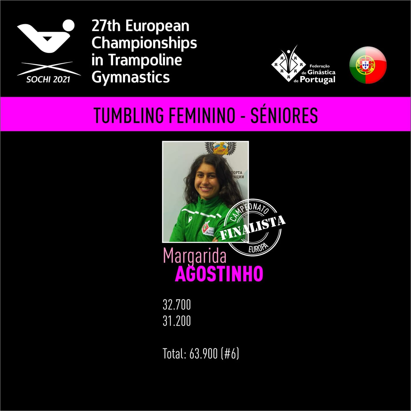 «A ginasta Margarida Agostinho, residente em Pinhal Novo, em representação de Portugal, classificou-se em 5.º lugar na final da competição individual de Tumbling, escalão sénior, do Campeonato da Europa de Trampolins, Duplo Mini-Trampolim e Tumbling, que se realizou em Sochi, Rússia, entre 29 de abril e 2 de maio.
