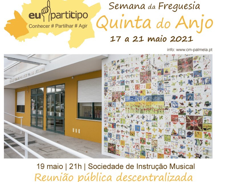 A Câmara Municipal de Palmela realiza uma reunião pública descentralizada no dia 19 de maio, quarta-feira, às 21h00, na Sociedade de Instrução Musical de Quinta do Anjo, no âmbito da Semana da Freguesia de Quinta do Anjo, com a seguinte ordem de trabalhos: