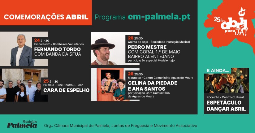 O 51.º aniversário do 25 de Abril no Concelho de Palmela vai ser celebrado com um conjunto de espetáculos musicais, em todas as freguesias, com destaque para “Dançar Abril” no Poceirão, Fernando Tordo com Banda da SFUA em Pinhal Novo, Cara de Espelho em Palmela, Pedro Mestre, em Quinta do Anjo e Celina da Piedade e Ana Santos em Águas de Moura.