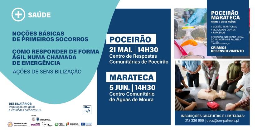 O Município de Palmela promove Ações de Sensibilização sobre “Noções Básicas de Primeiros Socorros” e “Como Responder de Forma Ágil numa Chamada de Emergência”, nos dias 21 de maio, no Centro de Respostas Comunitárias de Poceirão (no âmbito da Semana da Freguesia de Poceirão), e 5 de junho, no Centro Comunitário de Águas de Moura, às 14h30.