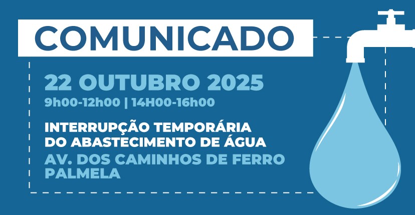 O abastecimento de água será temporariamente interrompido na Avenida dos Caminhos de Ferro, em Palmela, no dia 22 de outubro, entre as 9h00 e as 12h00 e das 14h00 às 16h00.