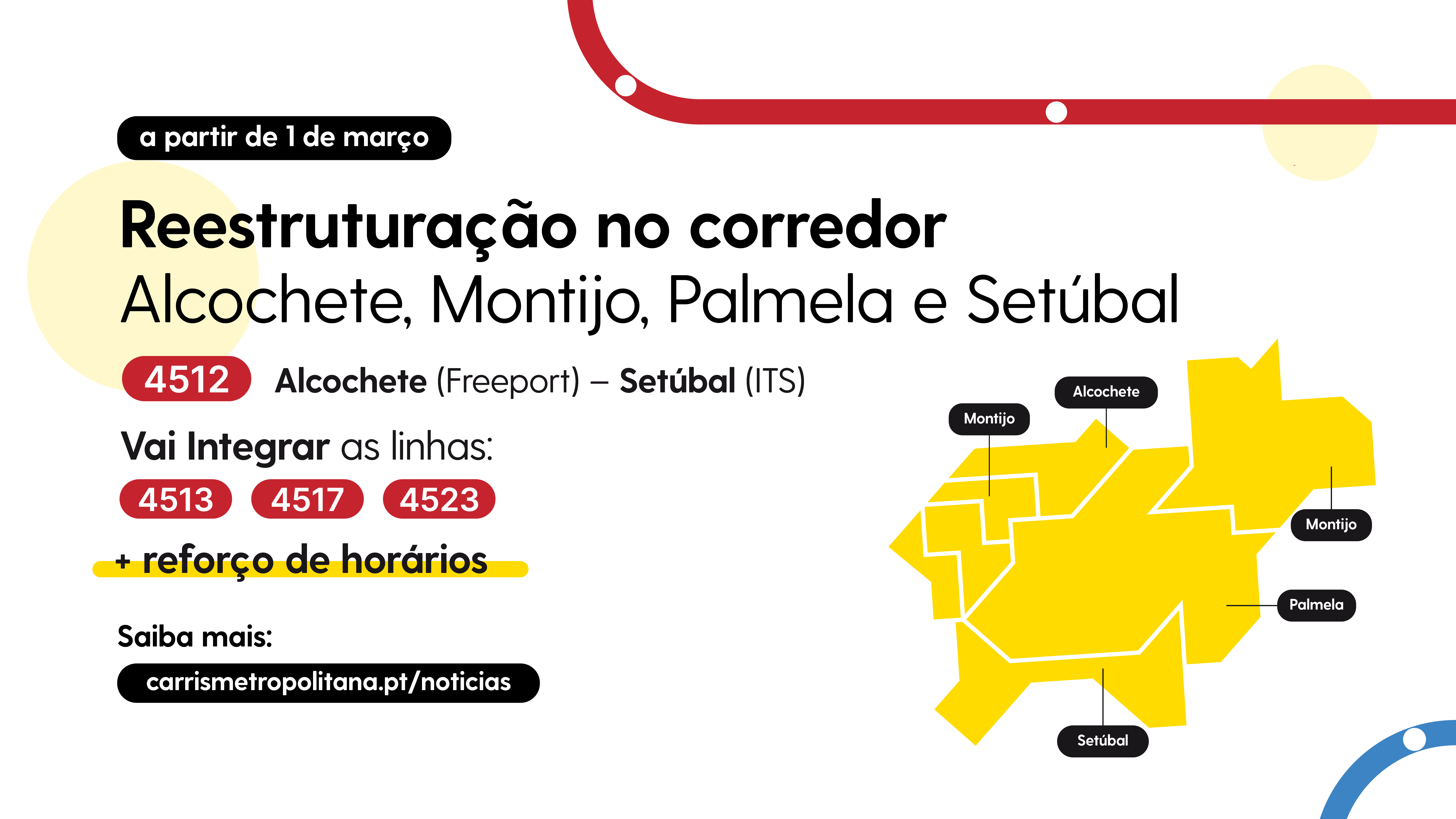 A linha 4512 da Carris Metropolitana vai ser reestruturada a partir de 1 de março, para otimizar o serviço no corredor Alcochete - Montijo - Setúbal - Palmela, garantindo uma cobertura mais eficiente e horários reforçados.
