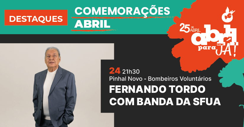 Fernando Tordo atua com a Banda da Sociedade Filarmónica União Agrícola no dia 24 de abril, às 21h30, na sede dos Bombeiros Voluntários de Pinhal Novo, num concerto integrado nas comemorações do 25 de Abril no concelho de Palmela. A entrada é gratuita (sujeita à lotação da sala).