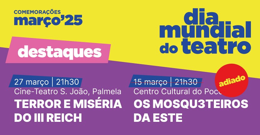 O espetáculo “Os Mosqu3teiros da ESTE”, integrado no programa do Dia Mundial do Teatro, que estava agendado para dia 15 de março, às 21h30, no Centro Cultural de Poceirão, foi adiado para nova data a anunciar em breve.