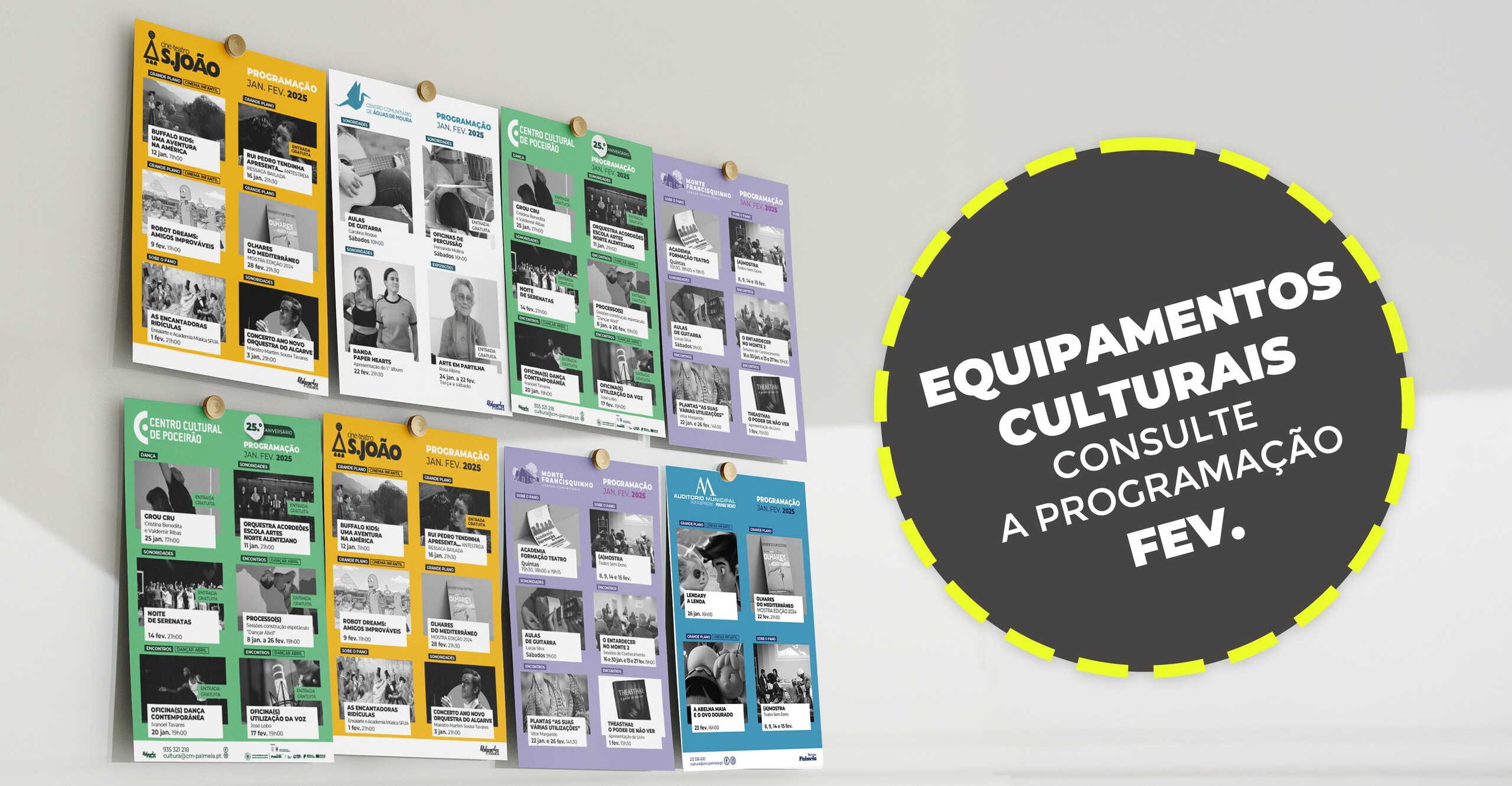 No Cine-Teatro S. João (Palmela), Auditório Municipal de Pinhal Novo - Rui Guerreiro, Centro Comunitário Monte do Francisquinho (Pinhal Novo), Centro Cultural de Poceirão e Centro Comunitário de Águas de Moura, não vão faltar propostas de Cinema, Teatro, Música, visitas, encontros, exposições e atividades para crianças e famílias.