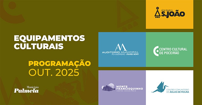 Em outubro, há muita música para ouvir nos equipamentos culturais do concelho de Palmela, nos vários espetáculos integrados no programa “Outubro - Mês da Música”. Mas há também diversas propostas de Teatro, Cinema, Dança, exposições, visitas, encontros e atividades para crianças, no Cine-Teatro S. João (Palmela), Auditório Municipal de Pinhal Novo - Rui Guerreiro, Centro Comunitário Monte do Francisquinho (Pinhal Novo), Centro Cultural de Poceirão e Centro Comunitário de Águas de Moura.