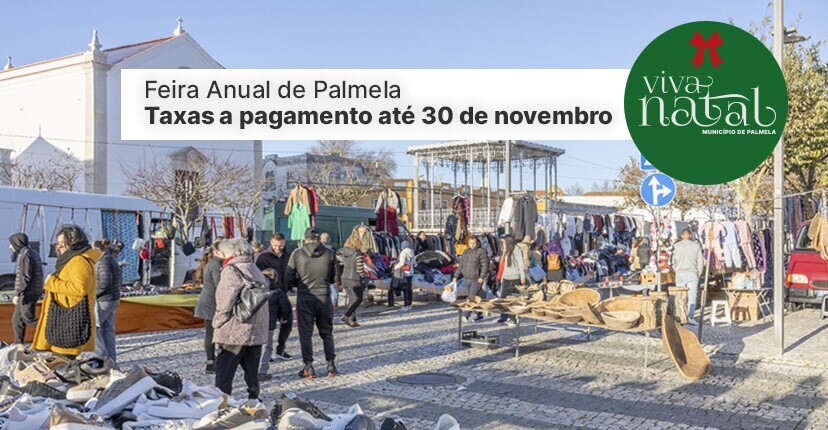 Estão a pagamento, até 30 de novembro, as taxas relativas à participação das/os operadoras/es económicas/os na Feira Anual de Palmela, que se realizará no dia 8 de dezembro, entre as 8h00 e as 17h00, na Vila de Palmela, no âmbito do Projeto “Viva o Natal no Município de Palmela”.