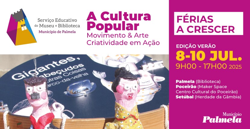 “A Cultura Popular” é o tema das “Férias a Crescer - Edição de verão”, que decorrem entre 8 e 10 de julho, das 9h00 às 17h00, na Biblioteca Municipal de Palmela, Maker Space Centro Cultural de Poceirão (Poceirão) e Herdade da Gâmbia (Setúbal).