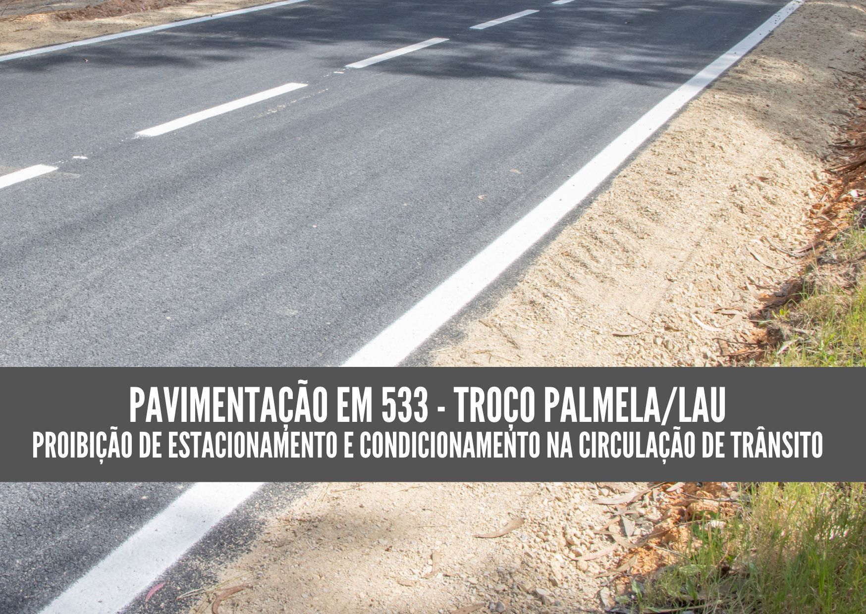 Na sequência dos trabalhos de pavimentação da EM 533, no troço Palmela/Lau, em curso, o estacionamento no local está interdito e a circulação de veículos condicionada, até à conclusão da empreitada, com exceção do trânsito de acesso às/aos moradoras/es.