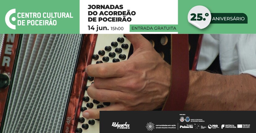 As Primeiras Jornadas do Acordeão de Poceirão realizam-se no dia 14 de junho, a partir das 15h00, no Centro Cultural de Poceirão, com entrada gratuita.